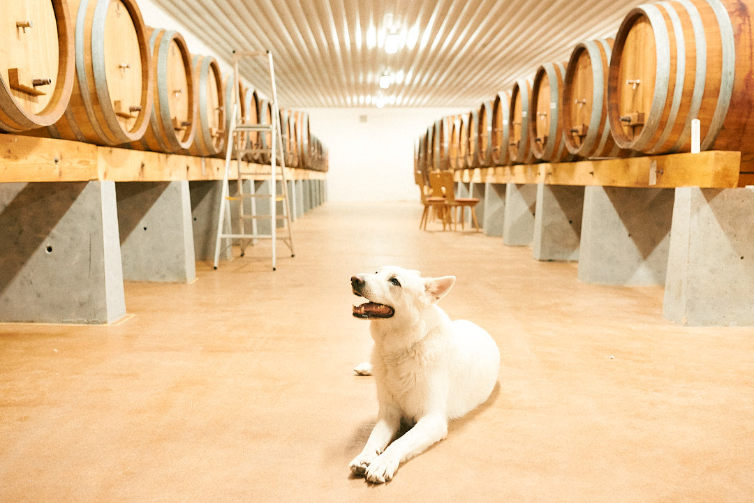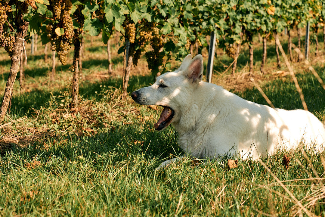 Jack, Jakub's Swiss Shepherd dog and inseparable companion that is always having a good time in the vineyard.
